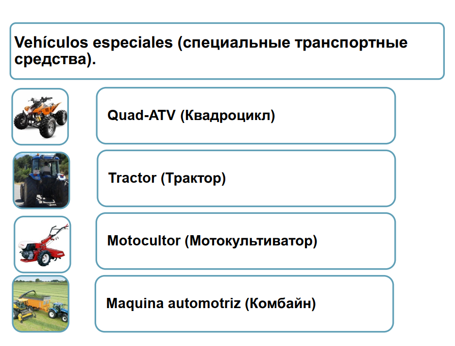 Automóvil (Автомобиль): vehículo de motor que sirve, para transportar personas, cosas o ambas a la vez, o para la tracción de otros vehículos (транспортное средство с мотором, которое служит для перевоза людей, вещей, обоих одновременно или для тяги других транспортных средств). Esta definición no incluye vehículos especiales (Это определение не включает в себя специальные виды транспорта).