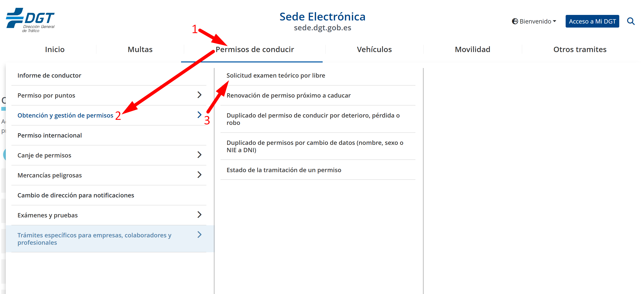Далее, на следующей странице, согласно стрелкам, как на картинке, выберите пункт: “Solicitud examen teórico por libre“