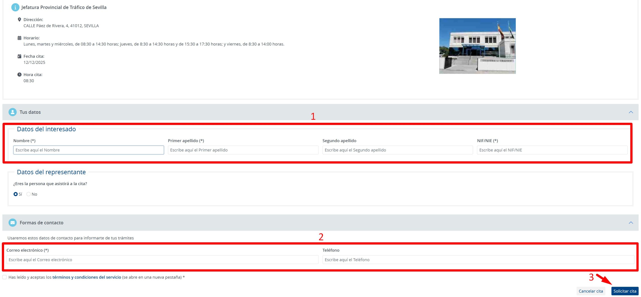 Здесь, важно все проверить, и если все правильно – нажать на кнопку “Solicitar cita” отмечена стрелкой 3.