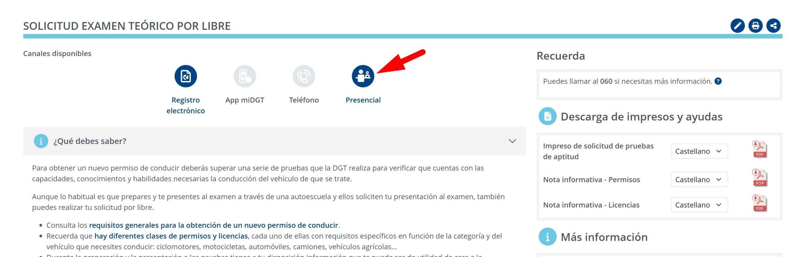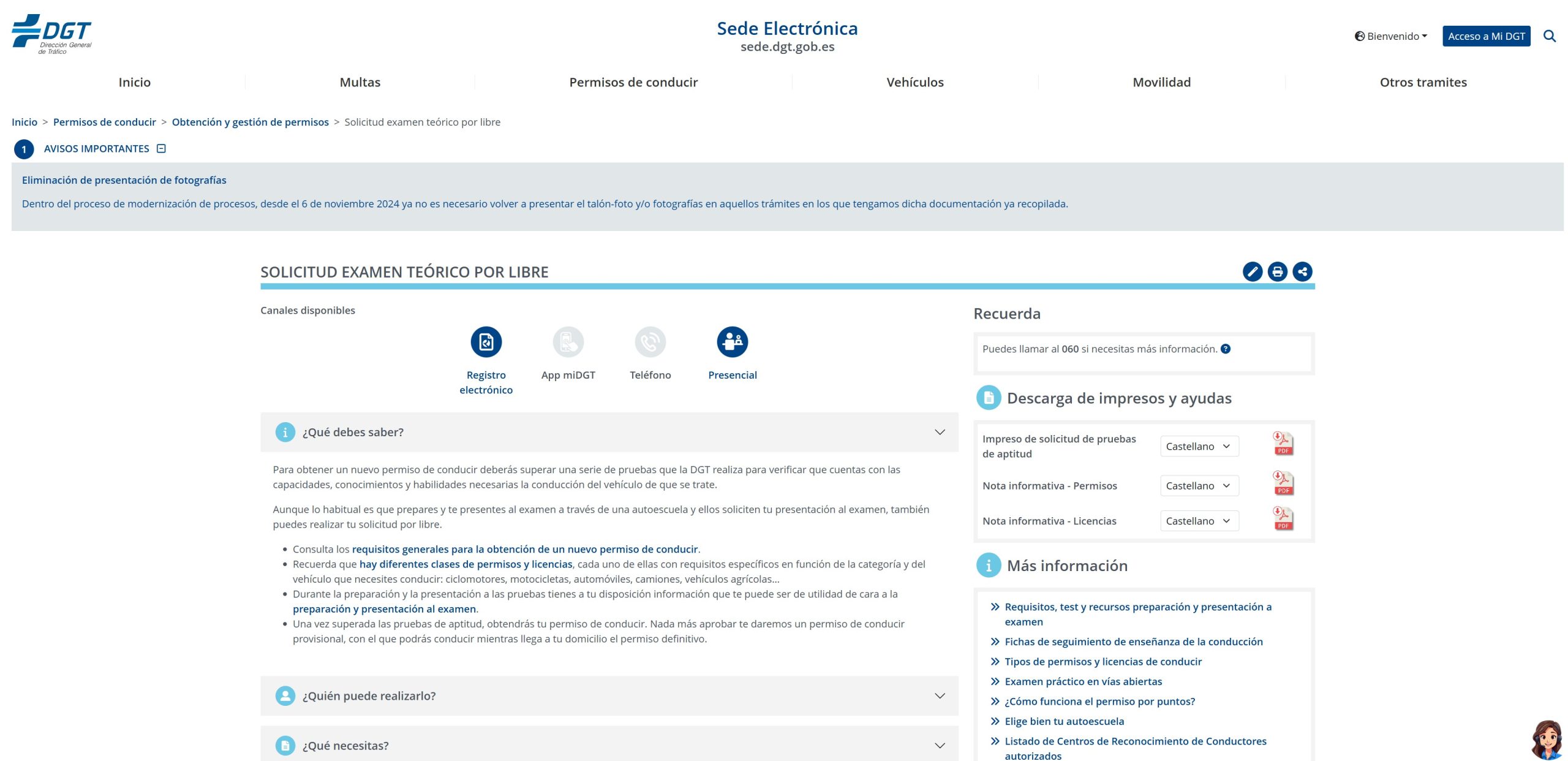 Далее на следующей странице, найдите пункт_ следуя стрелкам: “Solicitud examen teórico por libre” и нажмите на него, откроется следующая страница: