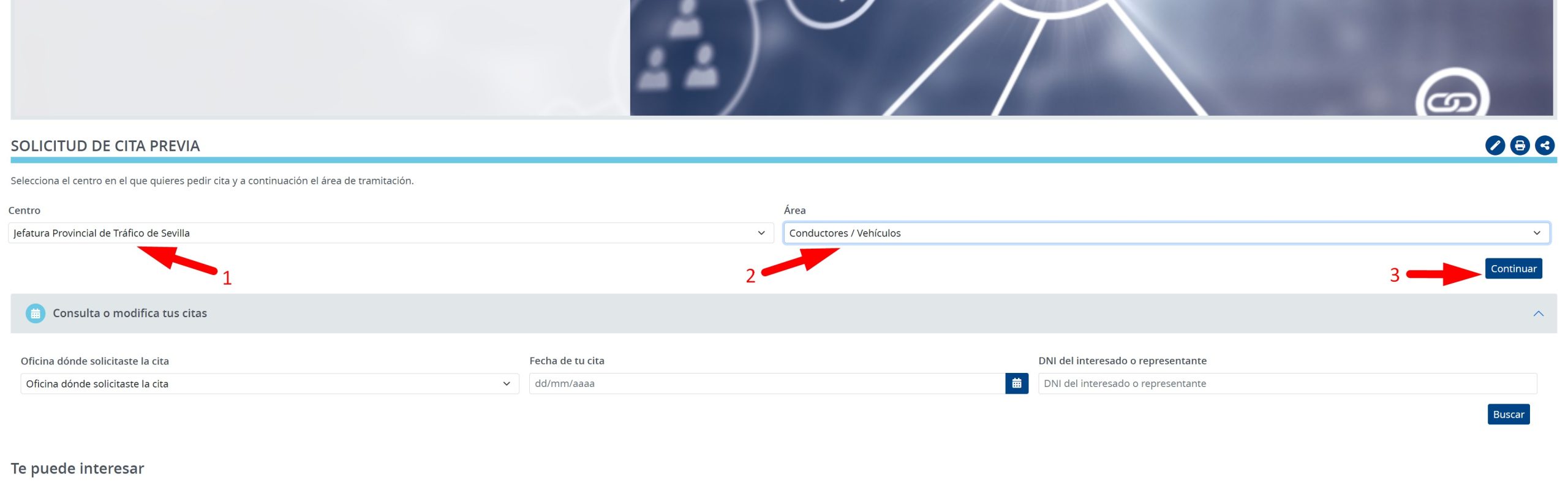 Затем, вам необходимо выбрать свой город и тип заявки на прием, Например, мы выбрали город: 1. Sevilla , тип заявки: 2. Conductores / Vehículos 3. Нажимаем Continuar в нижнем правом углу.