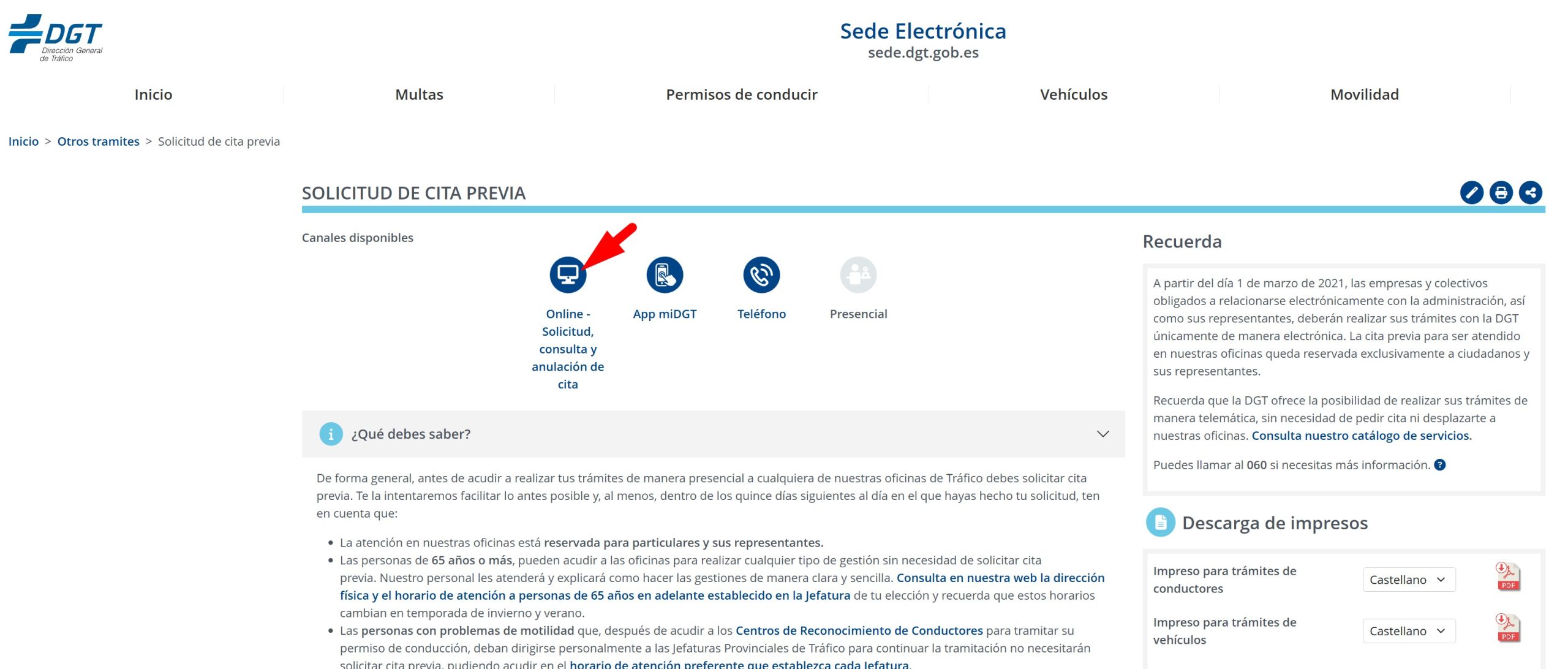 Откроется следующая страница, как на картинке: (2), здесь вам нужно будет спуститься и найти блок “Otros tramites”, обведен красной рамкой. И нажать на ссылку, куда указывает стрелка.